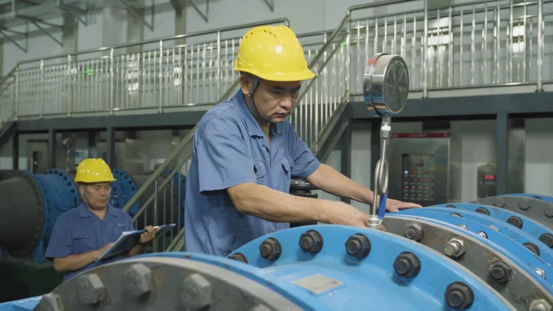 走进泵房深处,许师傅正俯身检修水泵机组。安全帽下的发丝被汗水浸湿,脸颊上溅着黑色机油,工作服已洗得发白,肘部磨出毛边——这些都是他二十年检修生涯的印记。