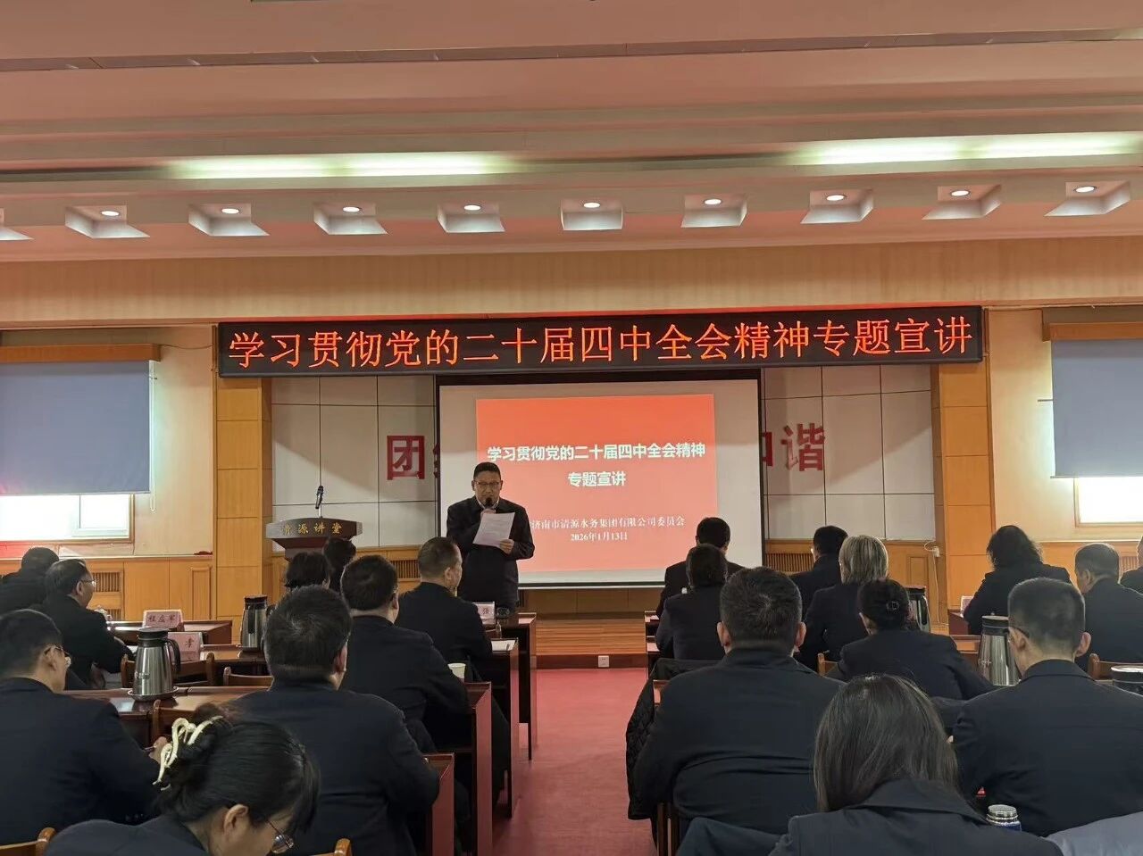 1月13日,谈球吧党委组织学习贯彻党的二十届四中全会精神专题宣讲。党委书记、董事长魏长学作宣讲报告,党委副书记、董事、总经理金强主持会议,集团公司领导、各职能部室主要负责人及各党支部书记、支委成员、党员、入党积极分子、群众、统战对象代表参加学习。
